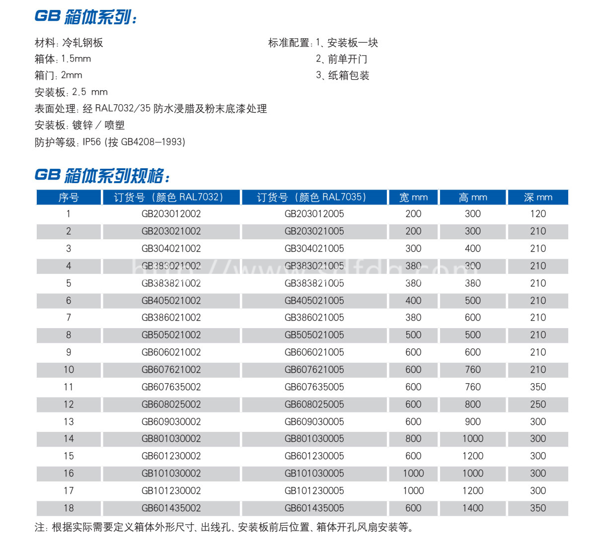GB箱體系列:材料:冷軋鋼板 標(biāo)準(zhǔn)配置:1.安裝板-塊